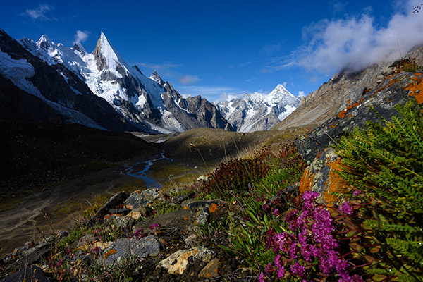 Passing through shepherd’s summer camp and the junction of the Gondogoro and Charakusa Rivers, we will cross a wooden bridge to reach Shaieshcho, which is a large shepherd settlement. The next day, we will trek to Dalsangpa, which means “field of flowers”. It is a beautiful campsite at about 4150 m, which lies between two lakes with Masherbrum and the white glacier cascading down from Masherbrum Pass reflecting in the still water.