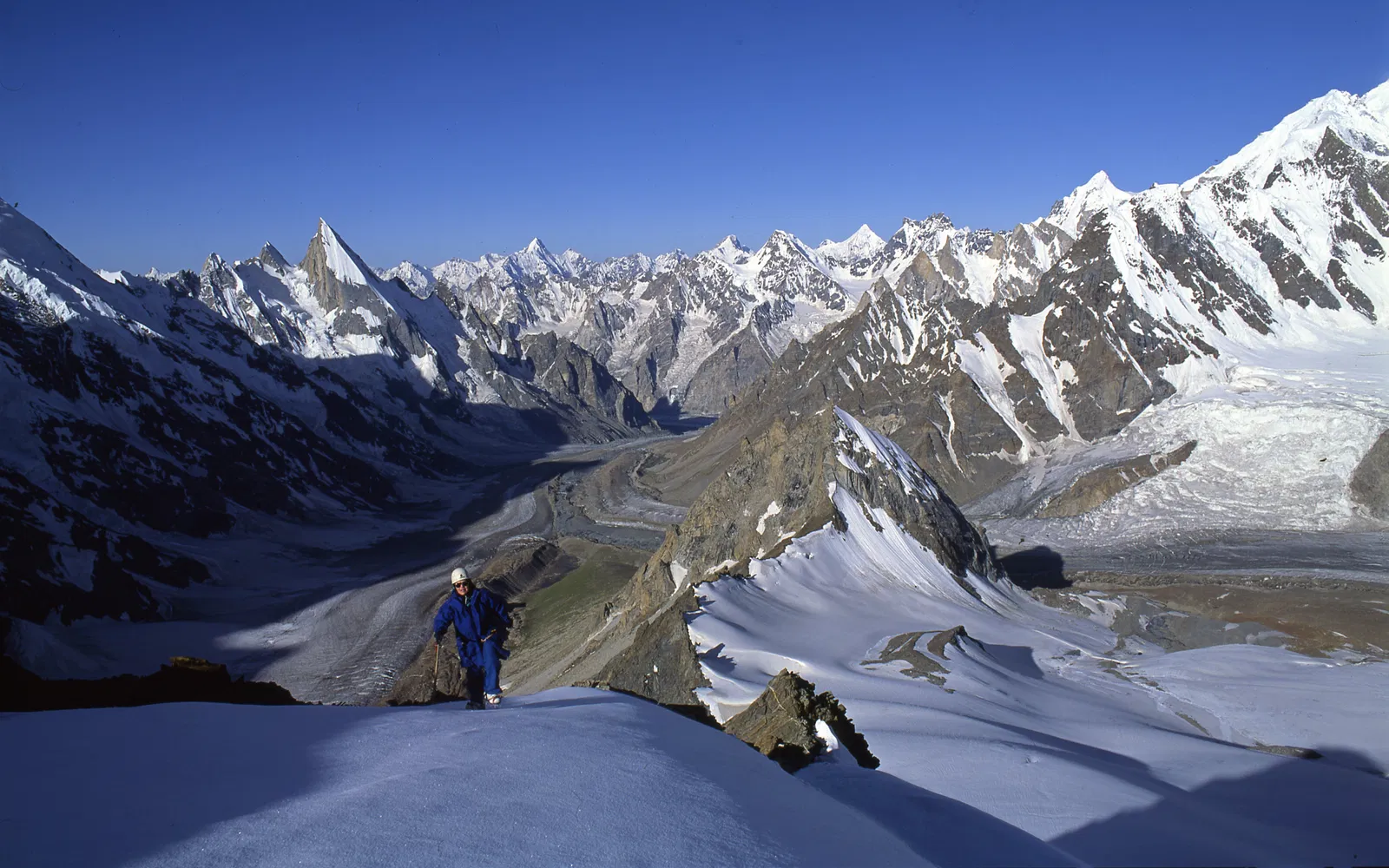 The panorama from Gondogoro Peak is quite spectacular. Masherbrum (K1), Chogolisa, Hidden Peak (Gasherbrum I / K5), Trinity Peak, Laila Peak and the Gondogoro glacier stretching down the valley can all be seen from the summit. It is even possible to see distant views of the summit of K2.
